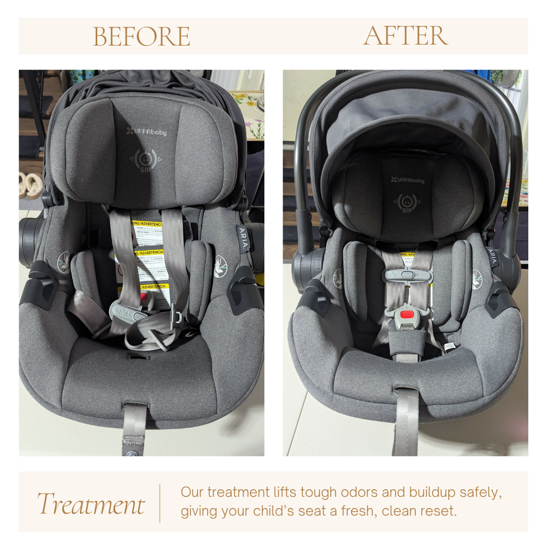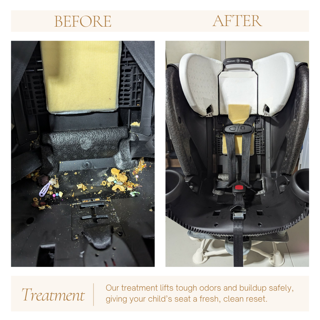 A full reset for heavily used or messy car seats. We begin with complete disassembly so every layer can be reached. All fabrics are removed and washed with gentle, baby‑safe products, while stains and odors are treated with care. Buckles, straps, and harnesses are cleaned thoroughly, and crumbs and buildup are cleared from every crease and hidden corner. Once everything is refreshed, the seat is reassembled with intention and given a safety check, leaving it clean, comfortable, and ready for your little one’s next adventure.